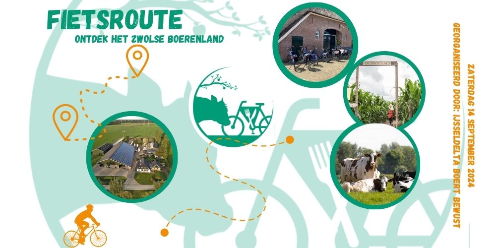 Wil jij graag kennis maken met het Zwolse boerenland? Zaterdag 14 september organiseert IJsseldelta Boert Bewust een prachtige fietsroute door het Zwolse landschap. Het is een mooie afwisselende fietsroute van ongeveer 45 km, waarbij je tijdens het fietsen 4 boerderijen bezoekt.