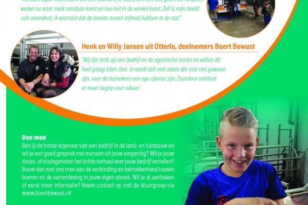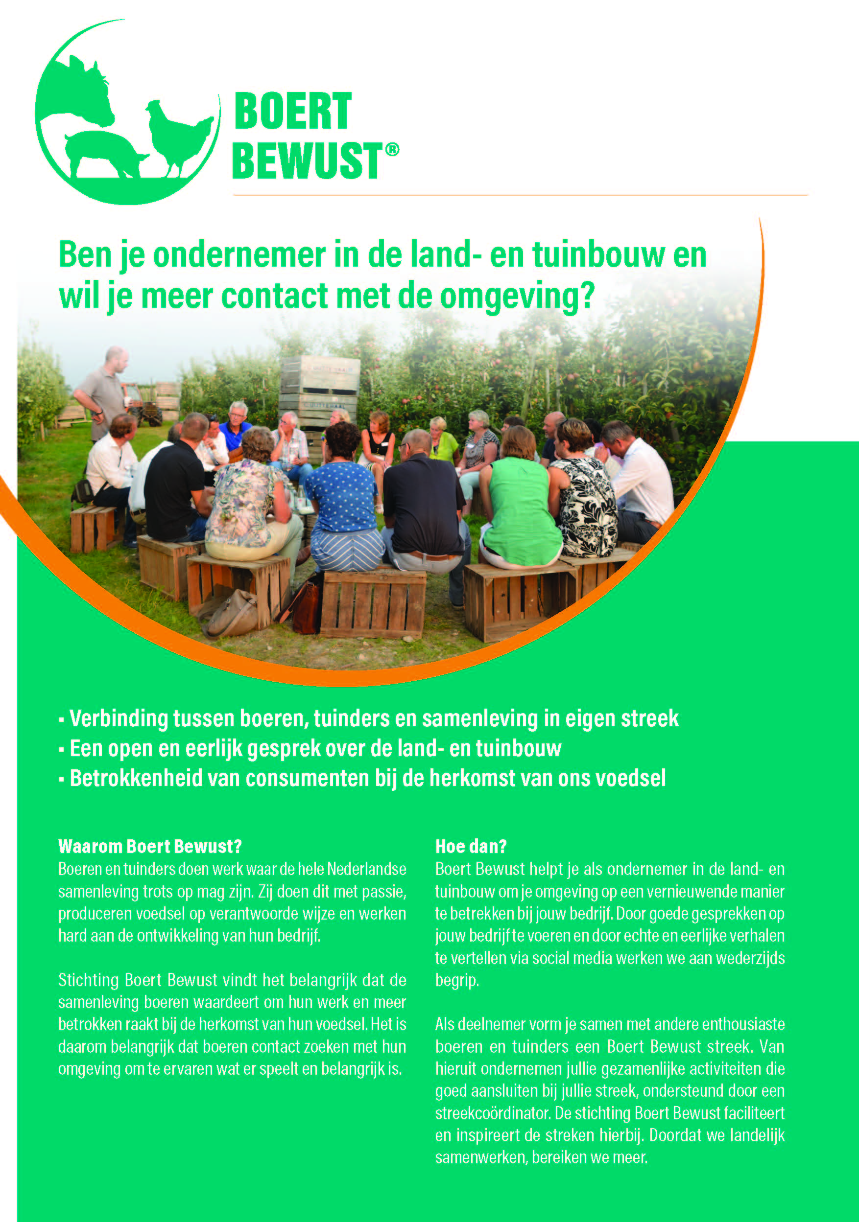 Boert Bewust helpt je als ondernemer in de land- en tuinbouw om je omgeving op een vernieuwende manier te betrekken bij jouw bedrijf. Door goede gesprekken op jouw bedrijf te voeren en door echte en eerlijke verhalen te vertellen via social media werken we aan wederzijds begrip. De aanpak